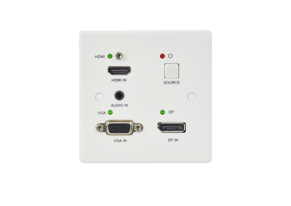 This 4K HDBaseT wall plug supports 3 inputs (HDMI/DP/VGA) and 1 output HDBaseT. Standard medium size 86 × 86mm wall boxes shall be used. 1080P @ 60Hz signals can be transmitted up to 70 meters and 4K@30Hz YCbCr 4:4:4 signals can be transmitted up to 40 meters through a single Cat6/6a network cable. The HDMI/DP input supports video resolutions up to 4K2K @ 30Hz, and the VGA input supports video resolutions up to 1920 × 1200 @ 60Hz. It supports both manual and automatic switching modes, as well as 24V POC function. Built-in bi-directional RS-232.